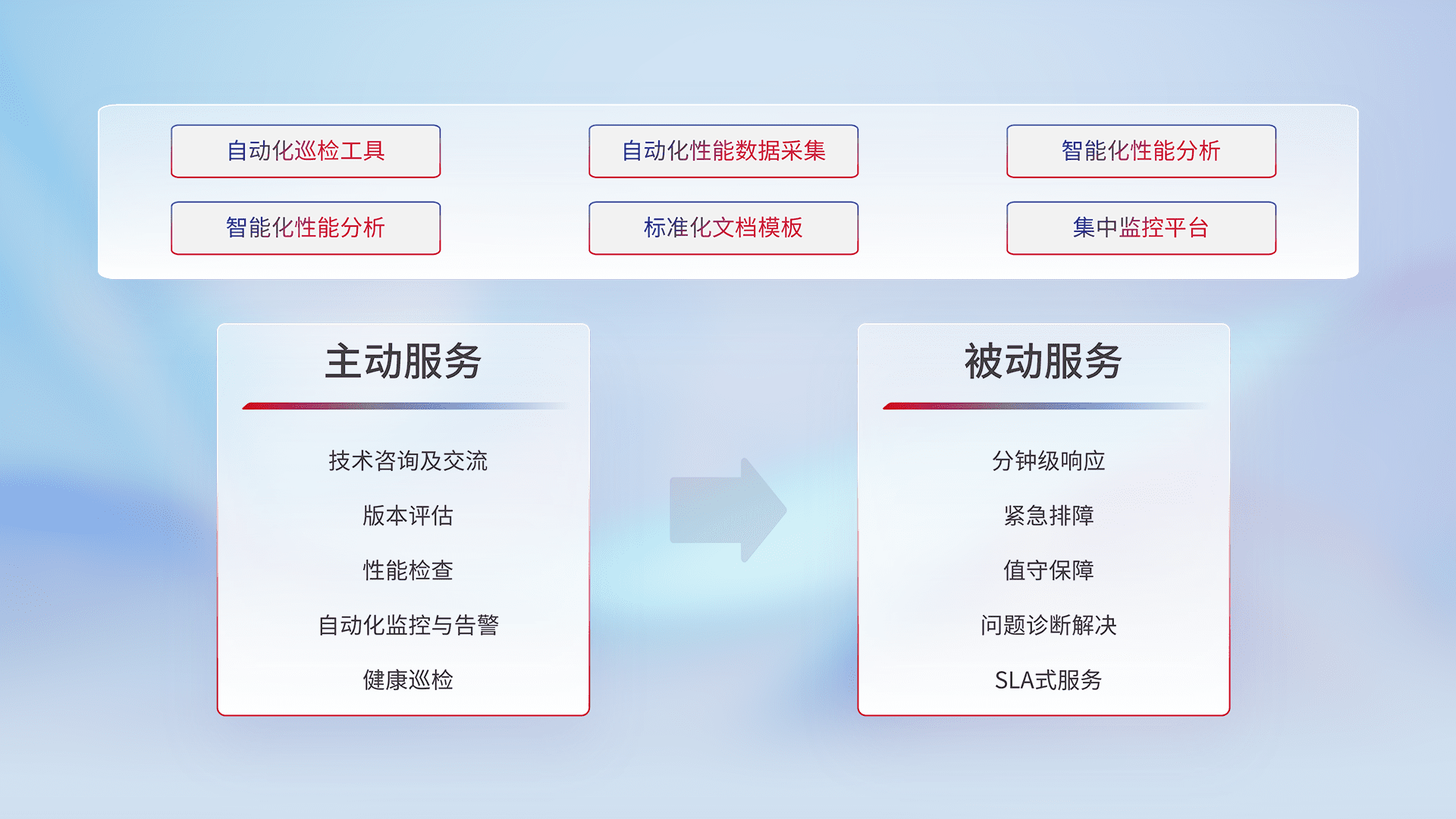 智能化工具和标准化文档,,,保障服务质量,,提供主动服务(包含技术咨询、、、、版本评估、、性能检查、、自动化监控与告警、、健康巡检)和被动服务包含(分钟级响应、、紧急排障、、、值守保障、、、问题诊断解决、、、SLA服务)。。。